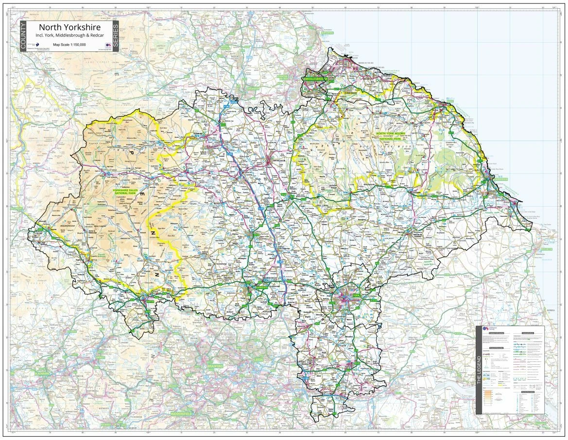 NORTH YORKSHIRE COUNTY WALL MAP. Ordnance Survey NEW for 2021